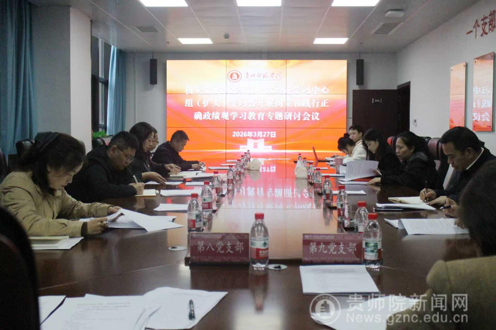 3月27日上午,机关党委在信息楼506会议室召开2026年第一次理论学习中心组(扩大)学习暨树立和践行正确政绩观学习教育专题研讨会,会议以“树立和践行正确政绩观,以新担当新作为助推学校高质量发展”为主题。机关党委中心组成员参加会议,机关党委各党支部书记(含主持工作同志)列席会议,机关党委书记张瑶主持会议并作总结讲话。